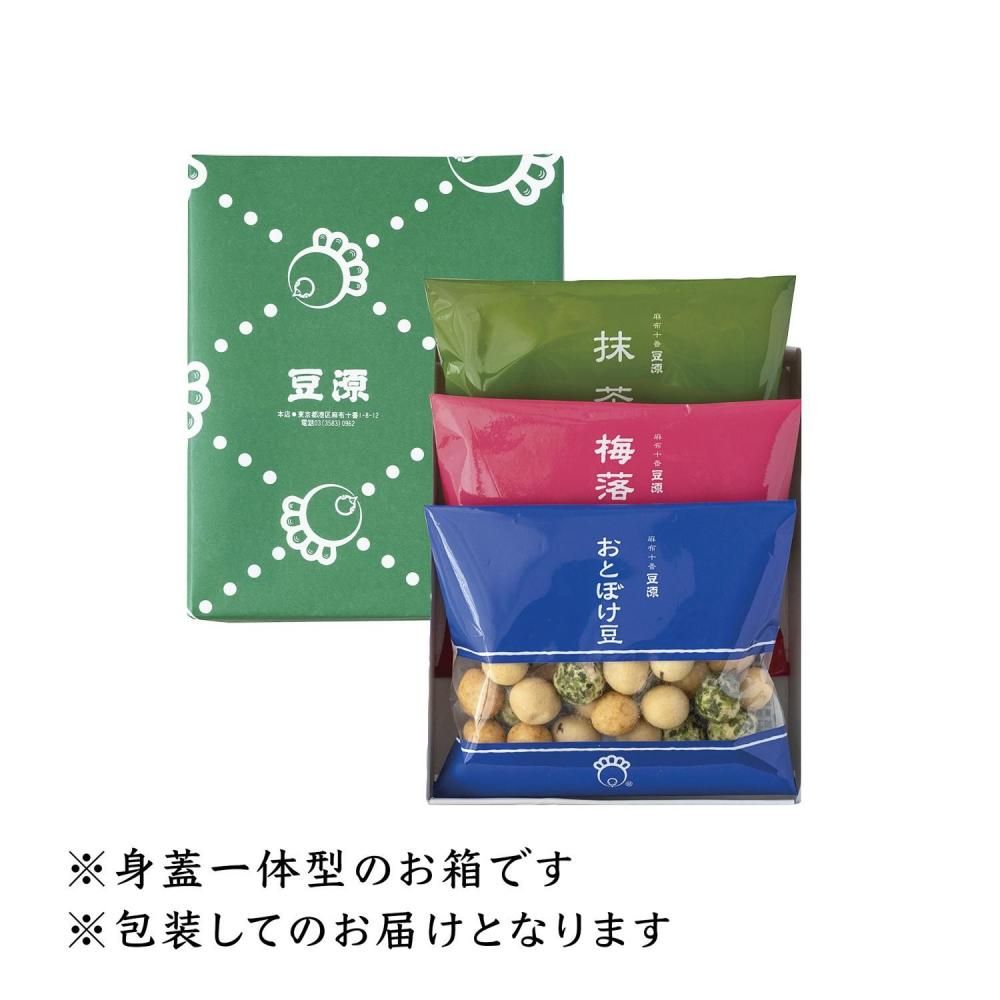 おとぼけ豆…(落花生)…豆源一番人気の豆菓子です。「青海苔」「きざみ海苔」「海老」の3種類が入った磯風味。
